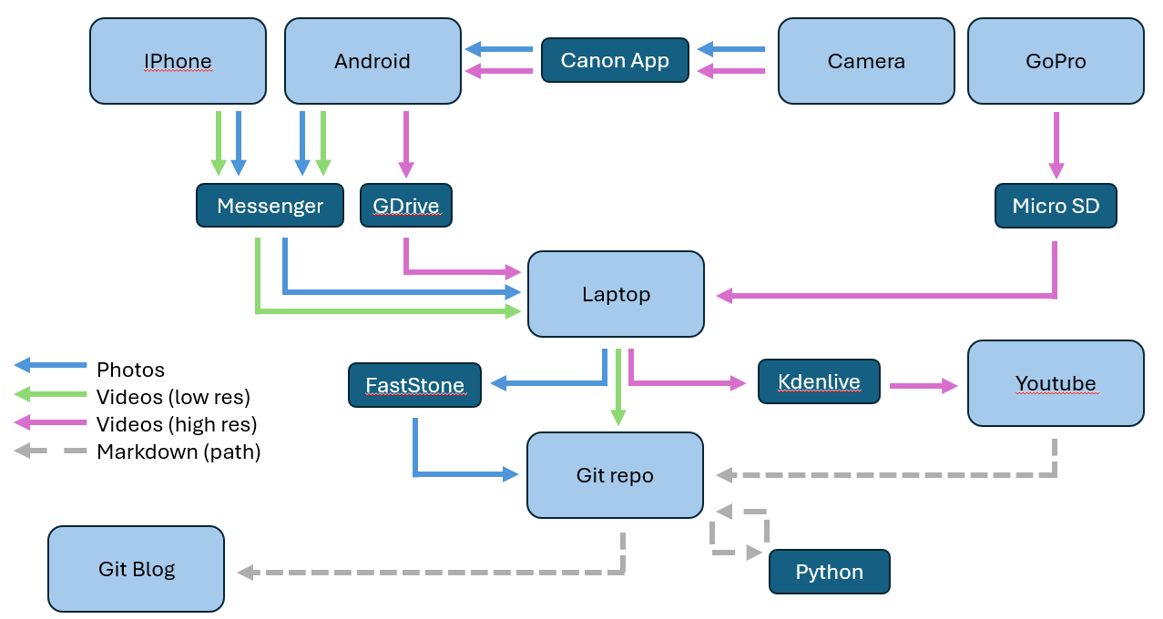 GoPro videos were easy to transfer: I simply plugged the micro-SD card into the laptop and moved files across. For high-res phone videos I bit the bullet and transferred them into Gdrive and then to the laptop, ideally when we had campsite wifi to use. for the Camera videos I had to transfer them to my phone via the Canon App bluetooth/wifi, and then to GDrive and the laptop.