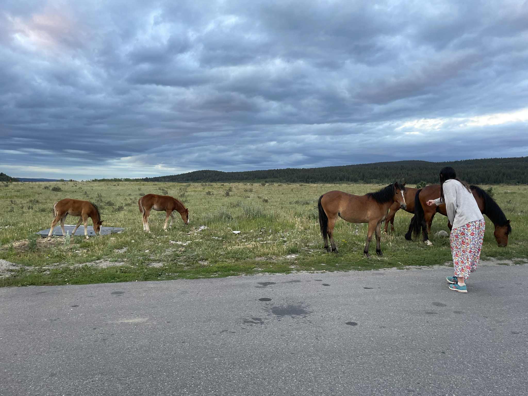 We rounded off our day with a visit to the Blake Distillery in Canmore for dinner and a drink, before heading back to our campground for another fire, smores, and card game session. Of course, we spotted horses on the way back so we had an obligatory stop for Fran to speak with them!