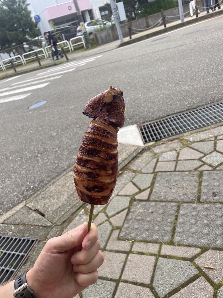 Today we headed down the coast on the train to explore the Enma Markets in Kashiwazaki. This is a well known festival in the area that has around 300 food markets lining the streets. We arrived and it was still a bit quiet as the stalls were just opening, however we were absolutely starving so after a walk around all the stands, we got some tasty pancake stick things which were blooming delicious and Mike chose a whole bbq’d squid which we won’t talk about!