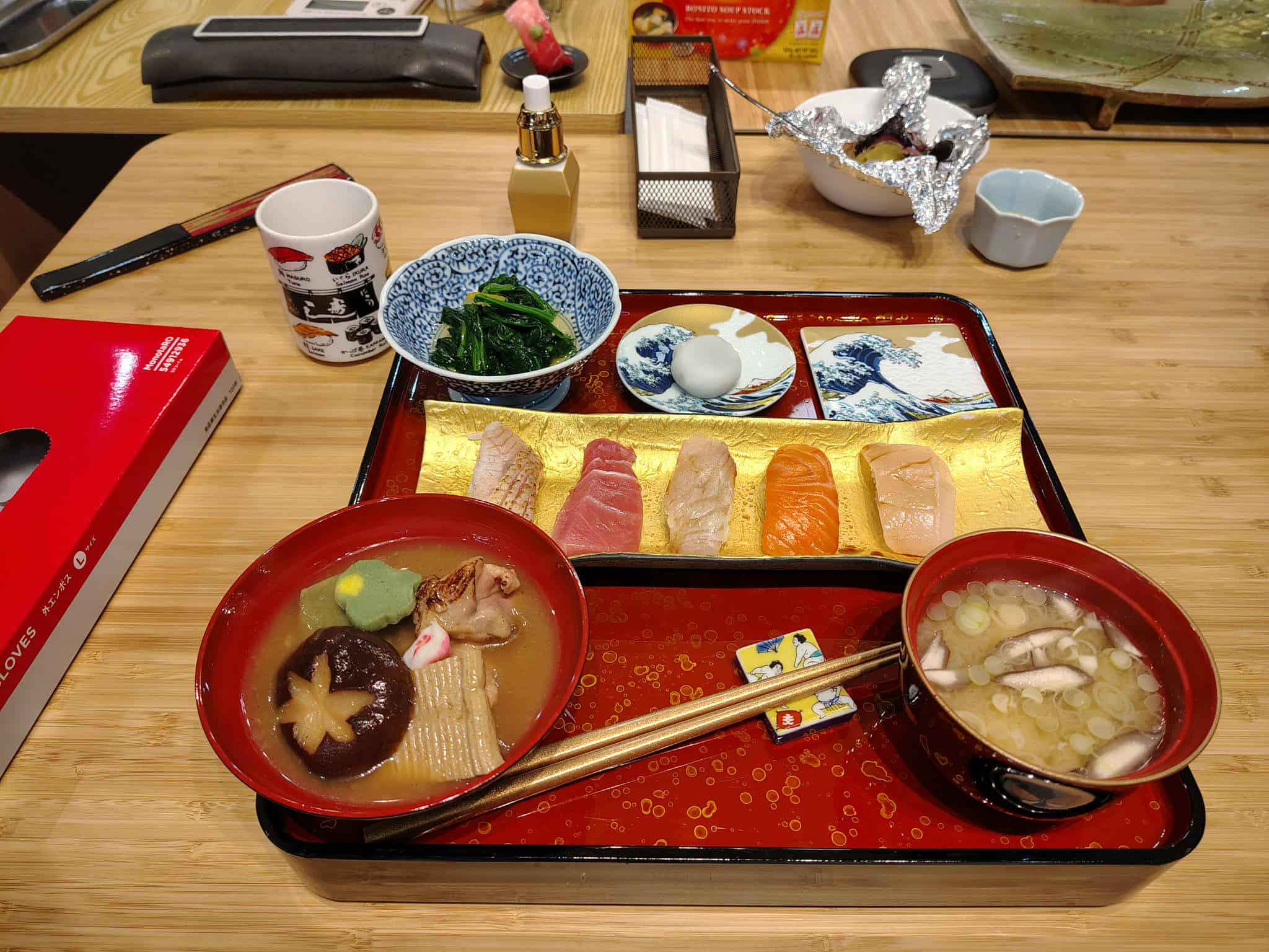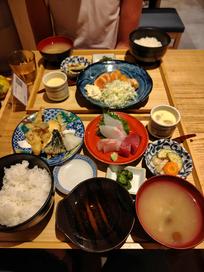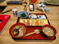Another travel day today but this time not too far as we were only heading to Kanazawa. We took an early train as we had booked a cooking class for the evening and we knew there was lots to explore! After dropping our bags at the hotel, we headed down towards the kenrokuen park and grabbed a delicious set meal on the way. We both got a yummy plate of sashimi, I had a salmon steak, Mike had tempura, and then as with most set meals, we got miso, rice and pickles to go with it. The big difference was this had some sort of set custard-y fishy dessert thing. It was awful and we definitely wouldn’t order it from a menu!