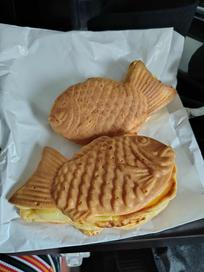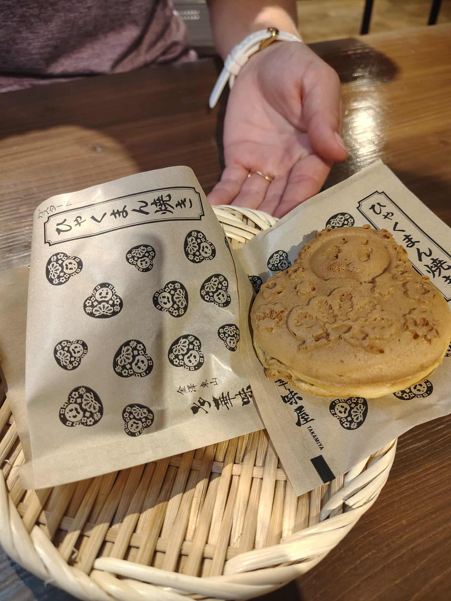 The area was lovely and quaint and we visited a number of old tea houses. In one of them we were treated to a yummy matcha tea and some fresh sweets which were made of aduzuki beans and their designs inspired by flowers. They didn’t picture very well, but in person they looked much better. We continued our stroll and saw a couple having a wedding shoot which was cool. The kimono was stunning but she must have been so hot, bless her. As we were leaving the area we noticed some freshly made taiyaki which were in the shape of a geisha and we just had to try them. We got one caffe latte and one custard. The hot cake section was delicious and the filling was also yummy.