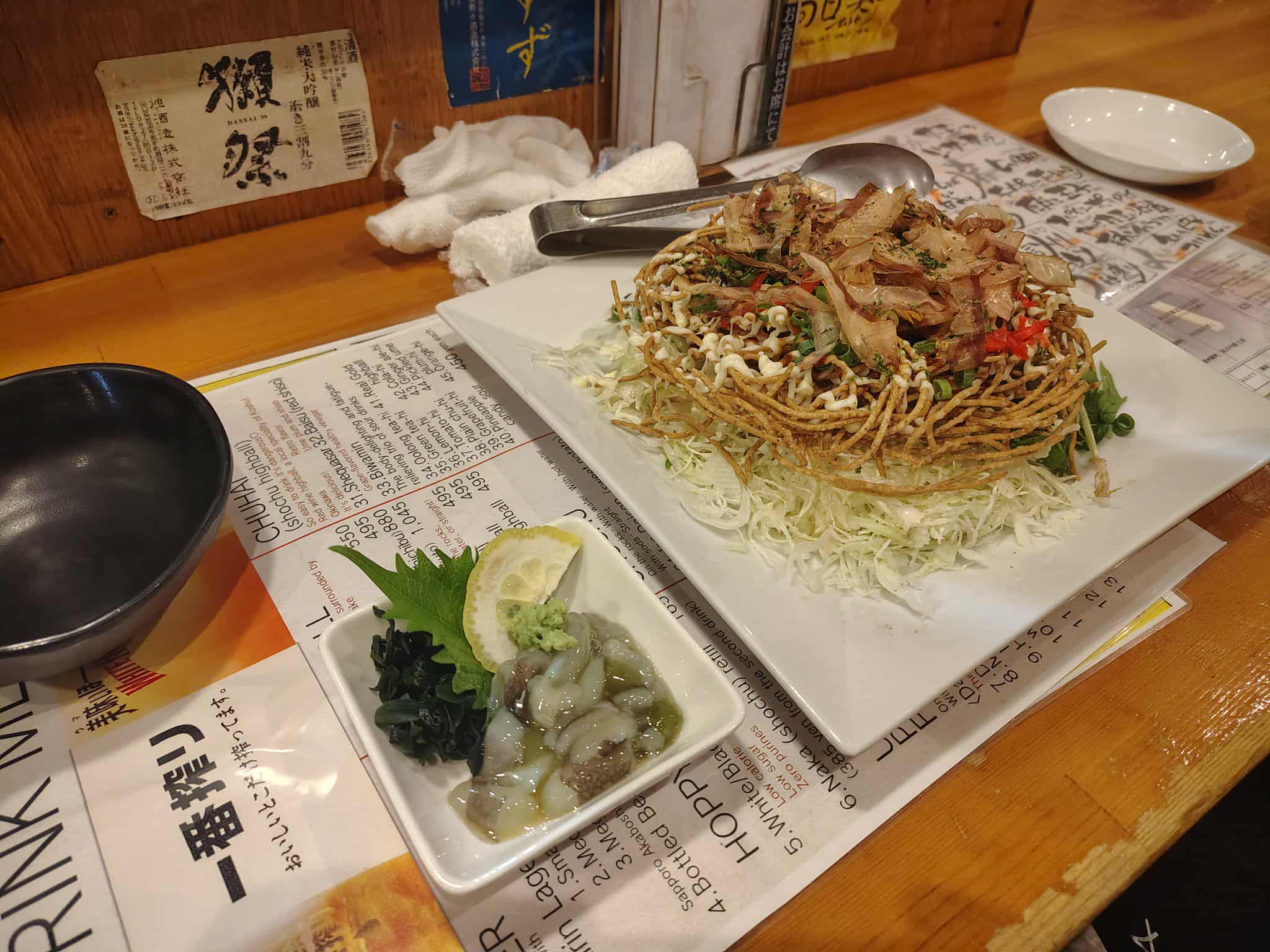 A train journey later and we were in Nagano. As usual we checked in, dropped off our bags, and went out to explore. We walked up to the Winter Olympics memorial to view the tower there, but it turns out the tower is about trophy size and on a small plinth, so needless to say we were somewhat disappointed. After a brief wander around the area we found our first actual Izakaya to eat at. We got an assortment of dishes to eat including sushi, a banging salad, and even some wasabi raw octopus. Unlike the local business folk we did not take advantage of the heavy drinking offers! With full tummy’s we headed off to the hotel to plan out the rest of our days in Nagano.